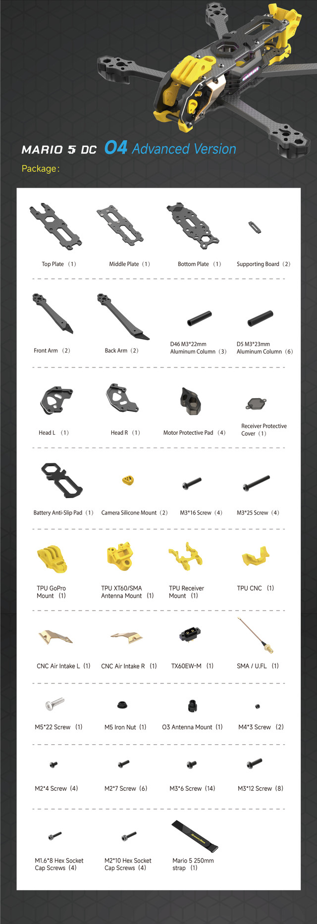 - Вага Mario 5 DC: 126 ±5 г (за винятком 3D-друкованих деталей), 167±5 г (з 3D-друкованими деталями та вставками)